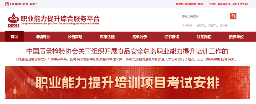 食物出产、加工企业中的高级办理人员和食物平安工做次要担任人,餐饮企业的高级办理人员和食物平安工做次要担任人,企事业单元中食物平安工做次要担任人和分担带领,畅通范畴相关企业的食物平安工做次要担任人,相关从管部分的食物平安监管人员,有志于处置食物平安办理工做的相关专业手艺人员等。培训完成报名且获得授权的进修账号后,可按照本身需要随时登录上述线上培训办事平台进行正在线年第四时度起头,拟正在每个季度的最初一个周六或周日进行培训测验(具体放置以本协会网坐发布通知为准);培训完成对应课程所需需要学时的进修后,按照相关要乞降相关登录上述线上培训办事平台正在时间内进行同一测验。第一步:正在旅逛器输入进入 中国质量查验协会官网,或者百度搜刮“中国质量检 验协会”进入官网。第二步:官网页面下滑点击“职业 能力提拔培训栏目” ,进 入职业能力提拔分析办事平台。第三步:进入《职业能力提拔分析 办事平台》点击进修中 心,进入登录页面输入账 号及暗码,点击登录。中国质量查验协会是由质量查验行业取质量范畴的质量查验手艺机构和专家学者、工做者,相关科研院所、大专院校、学术机构、企事业单元及质量工做取得显著成效的企业取企业担任人,取质量查验相关工做的社会相关人士等志愿结成的、行业性、非营利性社会组织,具有法人资历。中国质量查验协会筹备于1986年,并于1992年正式成立,行业次要办理部分为国度市场监视办理总局(简称国度市场监管总局),外行业次要办理部分的对口司局为国度市场监管总局质量成长局(牵头对口司局)、国度市场监管总局承认检测司。国度市场监管总局2018年4月组建成立之前,中国质量查验协会历任营业从管部分为原国度质量监视查验检疫总局(简称原国度质检总局)、原国度质量手艺监视局、原国度手艺监视局、原国度经济委员会质量局。
